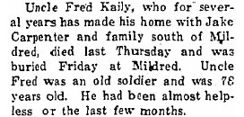Mary Kailey and her small son, Otto, who died in the Easter Blizzard of 1873. "Mary was a sister of Buckskin Charlie" By Janene (Written when she was a fourth grade student at Heartland Community School, Henderson, Nebraska.) It was April 13, 1873 on an Easter Sunday in the prairie of Nebraska. At the first sign of sunrise, it began to rain lightly. Fred Kailey and Charles White, known as Buckskin Charlie, had been working diligently trying to finish Fred Kailey's log cabin. When Fred and his wife, Mary, and baby son, Otto, moved to Nebraska in 1870 to homestead 160 acres of land that the government had given Fred, he built a log cabin. Then when Fred went on a hunting journey with his brother-in-law, Buckskin Charlie, his cabin was struck by lightning and burned to ashes on the ground. That's why Fred Kailey and Buckskin Charlie are building a new cabin on Easter Sunday, 1873. Fred Kailey and Buckskin Charlie were cold from working on the cabin because of the wind outside. The wind was blowing the snow between the cracks on the logs because the logs hadn't been chinked. Immediately, Fred Kailey's wife, Mary, started a fire with corncobs and lit it with a flint rock. As soon as the fire was giving off some warmth, Fred Kailey, Mary and baby Otto and Buckskin Charlie huddled together in blankets to keep warm. Since the weather was getting worse, Buckskin Charlie decided to go back home to his worried wife. So Buckskin Charlie got on his horse and rode to his house which was about one mile from Fred Kailey's farm. That Sunday evening, Mary, Otto, and Fred Kailey dressed in their warmest clothes and huddled, together in all of the blankets that they owned. Then the Kailey family snuggled near the fire trying to keep as warm as possible. All through the next three days, Fred and his young wife, Mary, held Otto closely trying to keep as warm as they could. Yet, the tiny snowflakes flew through the cracks of the unchinked logs and melted as soon as the snowflakes were inside. Therefore the Kaileys were soaking wet. By Thursday, the Kailey family was in a very serious situation. Snow was piling up on top of the Kailey's roof, and melting from the warmth of their bodies making Fred, Mary, and Otto even wetter. Fred Kailey knew that his only hope for survival was to leave the snow covered cabin and go for help to their nearby neighbor. If they didn't, they would surely freeze to death. Very soon, the Kaileys decided to go to their neighbor, Roger Shepherd. So they bundled up in their driest clothes. Then with all of his strength, Fred push the cabin door open and the three frightened Kaileys walked out into the fierce wind with violent snow whirling around them. As the Kailey family struggled through the deep snow, the powerful wind whirled the snowflakes against their faces making it very hard for the family to see clearly. However the desperate Kaileys struggled on trying to find their nearest neighbor's house, Roger Shepherd. Mr. Shepherd's sod house was their only hope for survival. Suddenly little Otto dropped down to his knees, so Fred knelt down and scooped up his exhausted child into his arms. As the Kaileys continued walking toward Roger Shepherd's house, Mary collapsed from exhaustion. Soon Fred was struggling in the deep snow carrying both his wife and child. Within moments, Fred realized it was impossible for him to continue walking in the direction of their nearest neighbor's house. The next thing Fred knew, he was lying in the icy, cold, snow beside his wife and child. Since Roger Shepherd's house was nowhere to be seen, the Kailey's had no hope for survival because they were very sure they were lost. Soon Fred knew that he would have to go for help, otherwise the Kailey's would perish. Next Fred explained to his loving wife and Otto to have courage until he returned with help. So after wrapping his arms around Mary and Otto, Fred turned around and started walking towards Buckskin Charlie's homestead. Even though Fred was completely exhausted, he made every effort to continue pushing on. When Fred was only a quarter of a mile from Buckskin Charlie's homestead, he fell down onto the icy ground. Yet, Fred crawled on his hands and knees the rest of the way to Buckskin Charlie's log cabin. After Fred crawled onto Buckskin's front porch, he desperately pounded on the door and yelled in a hoarse voice, "Charlie, help me!" Immediately Charlie opened the door and helped his brother-in-law into the cozy, warm house that was very comfortable. When Fred got inside Buckskin Charlie's cozy house, he explained everything to Buckskin Charlie and his new wife about Mary and Otto lying in the snow out in the cold blizzard. As Charlie's new wife went to get some warm, dry clothes and blankets for Fred, Charlie went to the barn to hitch up his horses and their sleigh. Soon Fred and Charlie jumped onto the sleigh, and Mrs. White handed them some warm bricks and blankets to keep their feet and body warm. Then they rushed across the snow covered field in search of Mary and Otto. While Charlie drove the horses and the sleigh in the direction of Roger Shepherd's sod home, Fred was very hopeful that Mary and Otto would still be alive. Since the snow was blowing fiercely, Charlie and Fred had difficulty seeing where they were going. The time seemed to move very slowly for Fred as he kept looking at his pocket watch. The time was very precious to Fred because his wife, Mary, and his little son, Otto, were suffering out in the blizzard. Way off in the distance, Fred noticed a familiar hump in the snow. As the blowing snow whirled around them, Fred shouted loudly in a hoarse voice, "Charlie, go that way. That might be them down the hill." At that moment Fred recognized a small piece of Mary's plaid dress sticking out of the big hump. Charlie quickly turned the sleigh around and finally Fred saw Mary and Otto lying motionless in the snow. Immediately, Fred jumped off the sleigh into the deep snow and hurried ove