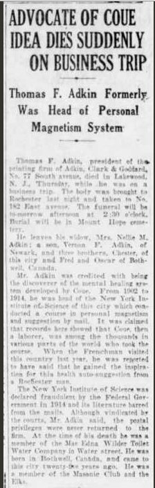 Thomas Franklin Adkin (August 12, 1871 Bothwell, Ontario - February 1924, Lakewood, New Jersey) was a Canadian-born businessman, beginning as a manager of stage hypnotists and eventually becoming a magnetic healer and manufacturer of nostrums, popularly known for his promotion of Vitaopathy through his New York Institute of Physicians and Surgeons and a number of related businesses. "Thomas F. Adkin Dies While on Business Trip", Rochester Times-Union (Rochester, NY): 2, 23 February 1924"