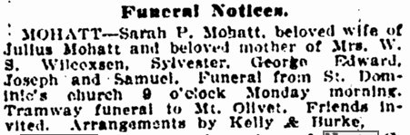 Julius 1851-1921 # 72024343, and Sarah Philomena Mohatt 1854-1913 are buried in Mount Olivet, Jefferson County, Colorado.