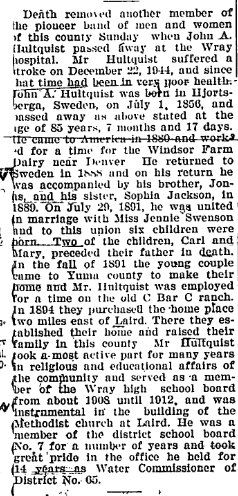 Philip Ray Hultquist, 83, longtime area resident, passed away January 29, 2010 at his home in Ft. Morgan. He was born February 19, 1926 in Laird, Colorado to Arthur E. and Helen A. Hultquist. Phil attended school at Laird, Colorado and graduated in 1944 from Laird High School. Following graduation and his 18th birthday he volunteered to serve in the United States Army during WWII. Following basic training at Camp Hood, Texas he went to Glasgow, Scotland on the Queen Elizabeth. They traveled by train to Southampton, England and crossed the English channel to Le Havre, France to join the 3rd Infantry Division and continued on to the final days of WWII at Salzburg, Austria. He returned to the USA and was honorably discharged in 1946 at Ft. Sheridan, Illinois. He returned to Northeastern, Colorado and married Fern Johnston on June 27, 1948 in Akron, Colorado. Phil enjoyed fishing and telling stories. He loved his family and friends and was greatly loved in return. In his later years he garnered a great interest in genealogy. Phil is survived by Fern, his wife of 62 years and their children Phyllis Berryhill, Gregg Hultquist and Kay Jarman, seven grandchildren, Tammy Hardy and husband Gregg, Gregory Hultquist, Bret Berryhill and wife Rebecca, Brian Berryhill and wife Jennifer, Jennifer Pagano and husband Major Colonel Tom, USAF, Scott Jarman and Tyler Jarman. He was preceded in death by his parents, his brother Carl Hultquist and his sister Jean Anderson. A Celebration of His Life will be held at the First Christian Church in Ft. Morgan, 225 Bijou, on February 19, 2010 at 11:00 AM for family, friends and the public. Cremation has taken place. The ashes will be buried in Wray, Colorado at a later date. In lieu of flowers, contributions may be made to either the First Christian Church or in Phil’s name to the charity of one’s choice in care of the Heer & Dahl Mortuary at 225 E. Platte Ave., Ft. Morgan, Colorado 80701. The Heer & Dahl Mortuary & Crematory in Ft. Morgan is in charge of the arrangements. |