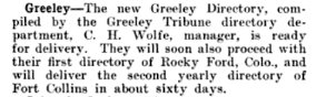 In 1920 Greeley, Charles H. WOlfe, and Eva M., both 60, have an apiary. Raymond, 21, born in Colorado, is a reporter for the daily-weekly newspaper.