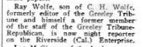 October 1916 "C. H. Wolfe of Greeley, a pioneer newspaper man of Colorado,