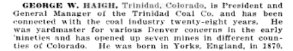 Mary Anne Haigh 1843-1913 is buried in Trinidad # 95056525. So is William Haigh 1842-1904 # 95056531