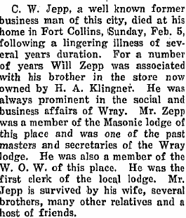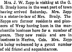 1917 "Mr. and Mrs. Will Zepp of Fort Collins, visited in Wray and vicinity with J.W. and P.E. Zepp, west of town and with Mr. and Mrs. O.S. Brady."