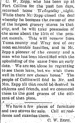 In 1904 they sold the store to E.B. Borland "Of the retiring firm C.W. Zepp will remain in Wray, while J.W. has removed to Denver, his family leaving this week."
