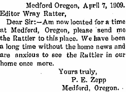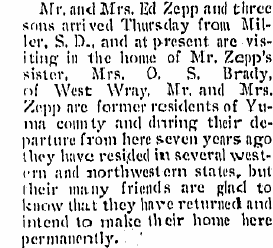 1909 "In a letter to Wray friends, it is learned that Mr. and Mrs. Ed Zepp have become dissatisfied with their location in Tennessee and have removed to California."