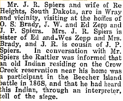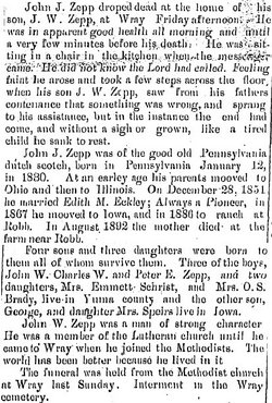 1917 "J.W. Zepp of the Robb ranch and Mrs. O.S. Brad of west of town (Wray) left Friday afternoon for Martinsburg, Iowa, where they went to attend the funeral of a sister-in-law."