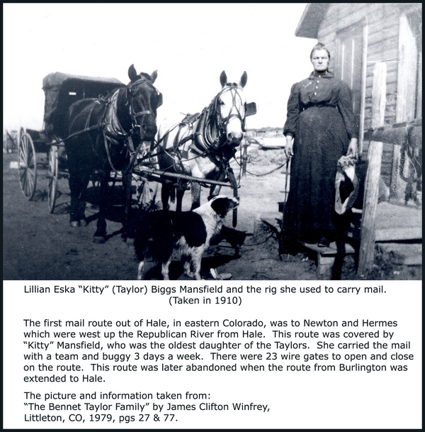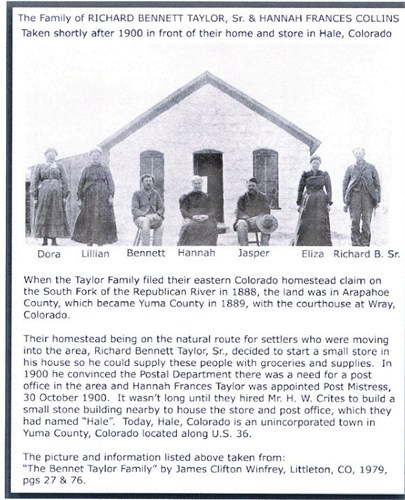 Richard Bennett Taylor, Sr. filed his homestead claim in 1888 for 160 acres one mile south of the Republican River and about seven miles west of the Kansas line. At that time the land was in Arapahoe County, then Yuma County in 1889 and finally Kit Carson County in 1890. In 1900 he convinced the Postal Department there was a need for a post office in the area and his wife, Hannah Frances (Collins) Taylor, was appointed post Mistress 30 October 1900. It wasn’t long until they hired Mr. H. W. Crites to build a small stone building to house the store and post office, which they had named, "Hale".
