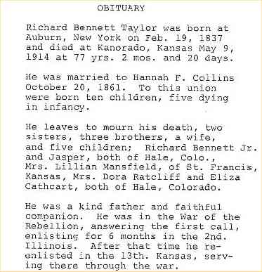 Richard Bennet Taylor, born Feb 19, 1837, died May 29, 1914, and is buried in the Kanorado Cemetery.