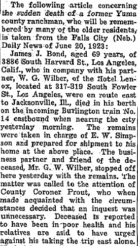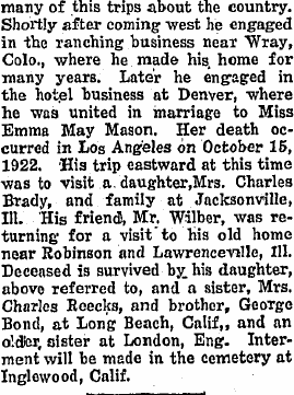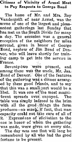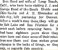 1912 "George Bond, who was down from Denver, attending the funeral of his son-in-law, Philip Daniels, of Idalia, returned home Wednesday."