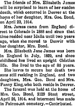 The following is graciously provided by Geoffrey A. James, Elizabeth Jane James' great-great grandson through her son William Joseph James. Elizabeth Jane James was born Elizabeth Jane Underwood, her 1829 baptismal record helpfully revealing her date of birth as 21 Dec 1828 in Southwark (then in the county of Surrey, now part of London). She married William Edward Henry James on 6 Jan 1852 in Stockwell (then Surrey, now London). This was William's 2nd marriage. His first wife, Julia Elizabeth Stark, died in 1848 aged 23. They had a daughter, also Julia Elizabeth, born in 1847, who married into the Austen family and emigrated to Canada in 1870. Elizabeth and William's first child was William Joseph James, born in Lambeth (then Surrey - now London) on 5 Oct 1852 barely 9 months after they were married! William Joseph is my great-grandfather. He married in 1880 which might explain why he didn't emigrate with his mother and sisters. He died on 24 Oct 1928. This means that my father - who was born in 1922 and died only in 2017 – remembered William and so my father knew the son and brother of the 3 members of my family you describe - Elizabeth Jane and her daughters Elizabeth Mary Alma and Frances Eliza ("Fannie"). Quite astonishing really, I think. My father described William Joseph as a "big man". As I tell my daughters, "Your grandad held the hand of a man born in 1852". Elizabeth Jane and William E. H.'s second child was Elizabeth Mary Alma James. Her birth certificate shows she was born in Dorchester, Dorset on 3 Oct 1854. William E. H. was living there at the time as he was a teacher in a convict institution after the prison in London where he previously worked had been emptied due to a cholera outbreak. Next was Robert Underwood James. Born on 24 Dec 1856 in Lambeth, his unusual middle name is of course a mark of respect to the mother's maiden name. His first name, Robert, was his grandfather's first name. Robert, like William, didn't emigrate with his mother and sisters, although he emigrated to Canada late in life in 1928 to be with his two daughters, Rosalie and Emily. He died in Quebec on 8 Sept 1935 and one of his daughters, Emily, died after her ship was torpedoed on the very first day of World War II, 3 Sept 1939. Their 4th child was Emily Marian James. She was born on 27 Nov 1859 in Islington (then the county of Middlesex, now London). She died aged just 20 on 2 July 1880, just 3 weeks before her brother William was married. Lastly, was Frances Eliza James, born in Islington on 2 Feb 1864 and died on her birthday in Denver in 1930, after a road accident. After William E. H. James died in Oct 1865, his wife moved back to Lambeth in south London and is shown there in the 1871 census with one son (William) and two daughters (Emily and Frances). The other son (Robert) is living with Elizabeth Jane James's father, Robert Underwood, near Southampton (Hampshire), while the remaining daughter, Elizabeth Mary Alma, is living near her mother, working as a domestic servant. I have no exact information to confirm when Elizabeth Jane and the two living daughters emigrated other than the conflicting data found on the US censuses. It is unlikely that Elizabeth Jane would have emigrated before at least one of her daughters. We know that Elizabeth Mary Alma married in 1887, a year after emigrating, and while it's possible she went with her mother, the 1900 USA census says that the mother had been in the USA 11 years by 1900 (suggesting 1889). This would mean that the mother had more likely travelled with Frances Eliza than with Elizabeth Mary Alma. Elizabeth Mary Alma (often just known as Alma by this time) James married George Richardson Bond on 30 June 1887, this being his second marriage. Frances Eliza (known as Fannie) married William C. King in 1899. Some space should perhaps be given to clarifying the question of whether or not Elizabeth Mary Alma Bond (nee James) had children of her own. A number of contemporary reports concerning her family in the USA contain unintentional errors which have found their way into family records in Ancestry, so gaining undeserved validity. Some reports, such as an obituary published in Santa Ana, California, state she had up to 5 children and variously name them as William, Clarence, Minnie, Florence and George Bond. Minnie was born in 1875, Florence in 1876 and George in 1878, years before Alma even arrived in the USA, before she married George in 1887 and during the lifetime of George's first wife, Mary, who died in 1884. They were, therefore, not the product of her marriage to George Bond but the girls clearly came to regard Alma as their mother for all intents and purposes. The child George died in 1884 so would not even have known Elizabeth Mary Alma. As far as William Sam Bond is concerned, the evidence shows that the 1900 Federal Census describes him as aged 14 (so born in 1886) and is listed as "Boarder", which would be strange if he is George or Alma's son. In the sections where the place of birth of his parents should be is the abbreviation "Un" implying "unknown". The 1910 Census states that both of his parents were born in the USA but neither George, his first wife, nor Alma were born in the USA. What all this seems to suggest is that William was not the son of Alma or George Bond, but that of a relative of George. For Clarence, the 1900 Federal Census does not mention him although he was apparently only about 4 years old at the time, which does seem odd. The 1910 Census shows him as "Charles P" and is described as "orphan", which would not fit with being the son of Alma or George Bond but would explain why he wasn't on the 1900 Census. Where the place of birth for his parents should be, it shows "(State Home)", a fact more likely to apply to the child than to his parents, given he is an orphan. The 1920 Census now shows him as "Clarence" aged 24 but that his father was born in Germany, which is not true for George Bond. His military registrat