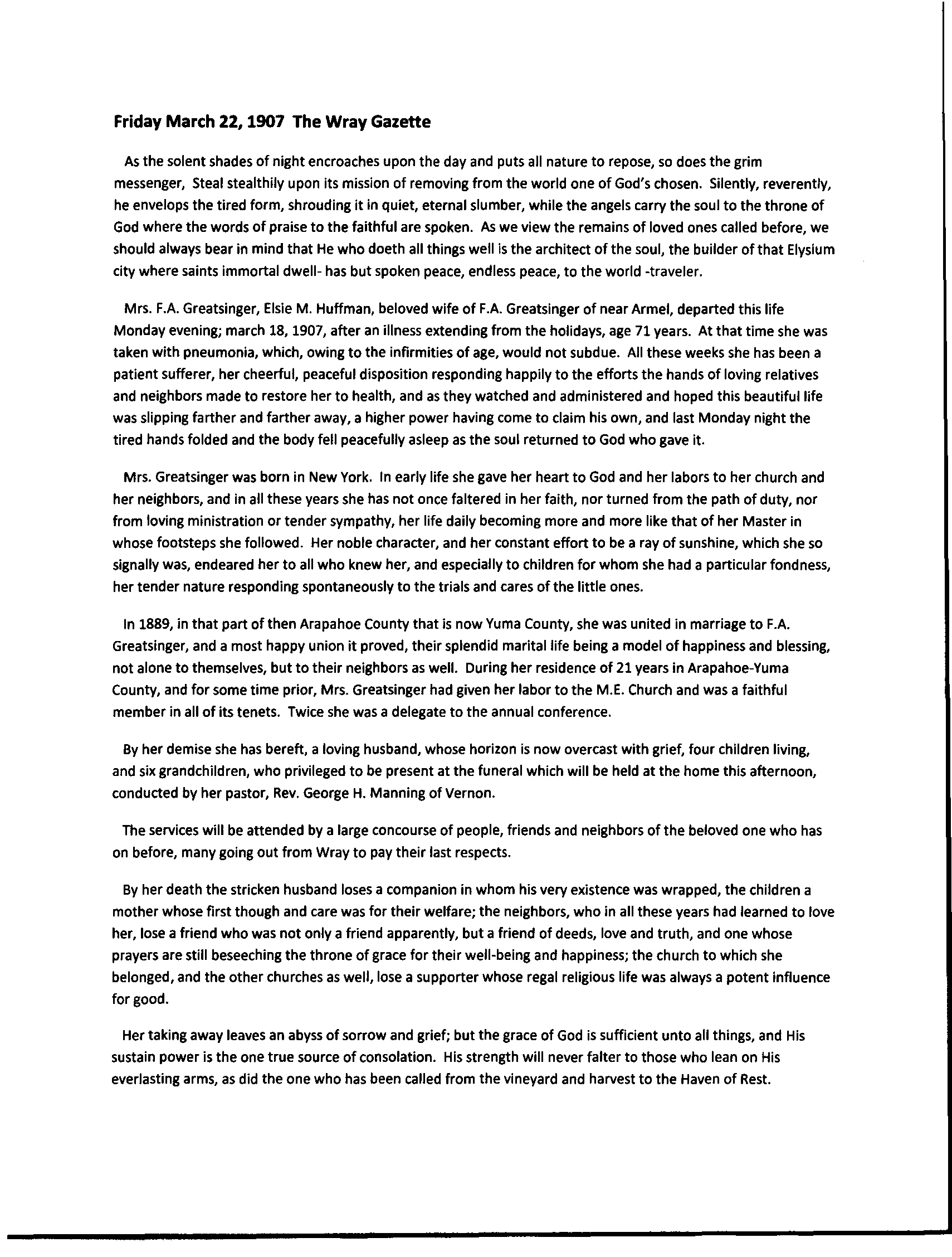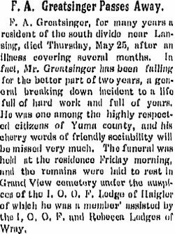 F.A. Greatsinger married Lizzie Dickson Feb 24, 1910, recorded in Yuma County.