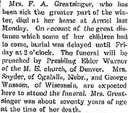 1905 "Miss Nellie Snyder arrived from Akron, Colorado to visit a few days with Mr. and Mrs. Greatsinger."