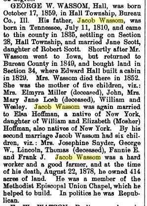 In 1870 Bureau County, Illinois, Jacob Wasson is 60, born in Tennessee, Elsie 33, New York.
