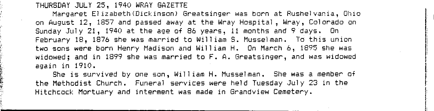 Margaret Musselman married Robert Dickson July 20, 1907, recorded in Denver.