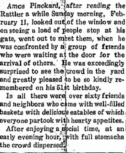 household goods for his mother who has moved to Arapahoe, Nebraska. This office (newspaper Rattler) acknowledges a pleasant call from Mr. Pinckard."