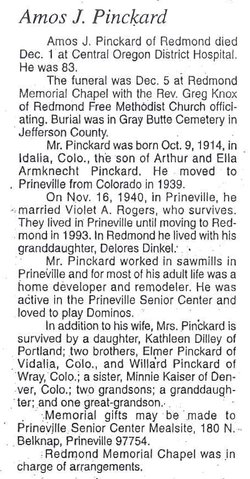 Irvin Amos Pinckard born March 15, 1909 in Colorado, died Oct 22, 1987 in Placer County, California.