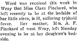 1914 Wray "Miss Clara Pinckard of west of town entertained her friend, Mrs. J. E. Carlberg of Parks, Neb., from Monday until Wednesday."