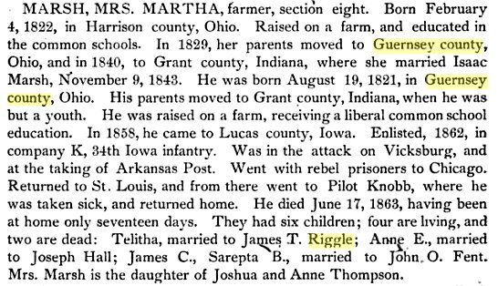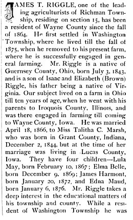 James T. Riggle was in Wayne County, Iowa (same county as the Mosher's) in 1880. James is farming 36, with Talitha 35, Lula May 13, Elma B. 10, Hasmont 8, and Edna M. 4.