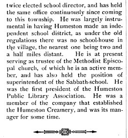 The following biography of J. T. Riggle, mention of whose death was made in the New Era last week, was written by Rev. R. Burton Sheppard of Bodne, formerly pastor of the local M E. church: J. T. Riggle, son of Isaac and Elizabeth Riggle, was born in Guernsey county, Ohio, July 3, 1843, and died in National City, California, February 21, aged seventy-one years, seven months and eighteen days. He had been ailing for some time, but feeling better a couple of days Before his death, he took a walk of a few blocks which proved to be an over-taxation of the heart, and the end came about 9-30 p m. Sunday, February 21. Until ten years of age he lived with his parents in the state of his birth. In that year, 1843, residence was changed to Illinois, and when twenty years of age he came to Iowa. Most of the time since, he has been a resident of Wayne County, owning a farm at the east edge of Humeston. With his family he moved to California about two years ago in order to enjoy the benefits of a milder climate. His last visit to Humeston was in the fall of 1914, when, with his wife, he returned to see old friends and look after business interests. On April 3, 1866, Mr Riggle was married to Miss Telitha C. Marsh, to which union were born four children; Lulu M., Elma B. , Harmont, and Maud. Mrs. Riggle, Lulu M. and Maud are still living, and were at home at the time of his death. At the age of twenty-one years he joined church in a little school house on the plains of Iowa, and from that time remained a member of the Methodist church. His interest in the church is a well known fact. Eager for the furtherance of religious endeavors, he was always found working with an enviable whole-heartedness wherever opportunity offered For years he was one of the "stand-bys" of the Methodist church in Humeston,and bis earnest wish was ever to see the hurch, in both material and spiritual things, keep step with the forward movements of the times. He was particularly interested in the Sunday school, and work with the boys, and these departments always had his hearty support. In the different capacities of teacher and superintendent, he has left his imprint upon the local Sunday school of the Methodist church. Nor were his interests confined to distinctly church activities. He was of that type of men who feel a personal obligation to manifest an active interest in everything pertaining to the welfare of the community along the lines of both political and social betterment. His death removes a most worthy citizen. The loss is larger than individual or family, and the entire community extends a genuine sympathy to the wife and daughters in their sorrow. The funeral was held at National City, California, Wednesday morning, February 24, at eleven o'clock. The body will remain in a vault in that city until friends or members of the family return to Humeston, when it will be brought to this place for final interment. |