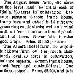 1911 "Sales are quite the fashion around this country. August Boesel had a sale last week at his place five miles northeast of Idalia which proved to be a great success. In losing August Boesel and wife the country loses one of its best farmers."