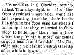 W.F. Crites of Hale was in Wray to meet his daughter and son-in-law, Mr. and Mrs. Henry Claridge, who just returned from Arkansas. (one of the newpapers got the name wrong ?)