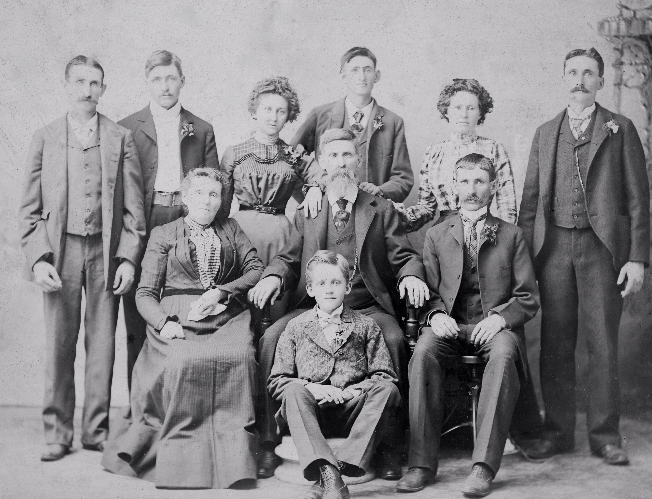 Back row L-R: Edward Enoch Arthur, Frank Dean Arthur, Elizabeth R. "Lizzie" Arthur Cavender, Walter J. Arthur, Jessie Elma Arthur Fletcher, and William David Arthur. Front four L-R: Mary Dillon Arthur, Melvin Arthur, William R. Arthur and John Henry Arthur. About 1900-1902. THANK YOU DOUG SILVERSON