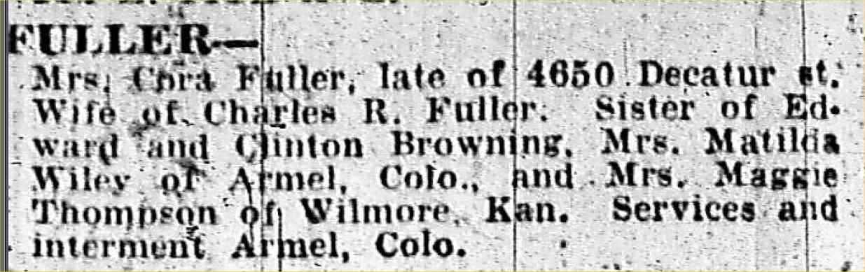 Charles R. Fuller and Bertha Josephine Fuller are buried together in Denver's Fairmount Cemetery, Sections 2,4 Lot 323, Block 36. They do not have a headstone.