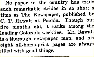 In 1904 "C.E." Rawalt purchased the plant of the Gunnison Tribune, "who will remove it to Paonia and establish a fourth paper in that village."
