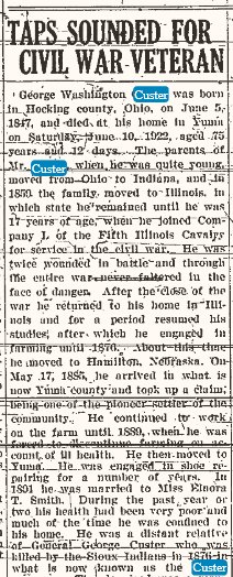 In 1902 George Custer was Yuma marshal. Other newspaper articles later mentioned that he recorded rainfall, had a barber shop, sold coal, and was granted a special veteran pension by Congress. He participated in most veteran gatherings.