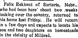 Another Buffalo County homesteader, Felix Eckhout and his wife, Flavia, purchased the Freighters Hotel property in 1898, and it has remained in the Eckhout family.1900 Kearney "Mrs. Flavia Eckhout filed a petition with the clerk of the district court Saturday asking for a divorce from her husband, Felix Eckhout She asks for the custody of four of her children. "