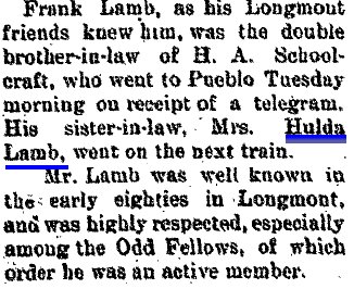 1921 Longmont "Mrs. Hulda Lamb left last Friday for Yuma Colo., expecting to remain several weeks visiting with her son, Fred Lamb, and wife."