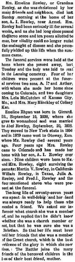 In 1900 Allen County, Kansas, Able G. Rowley is 65, Emeline 61, "Aurther" 40. Annie Ryne, Emeline's sister, born April 1836 in Illinois, is also with them.