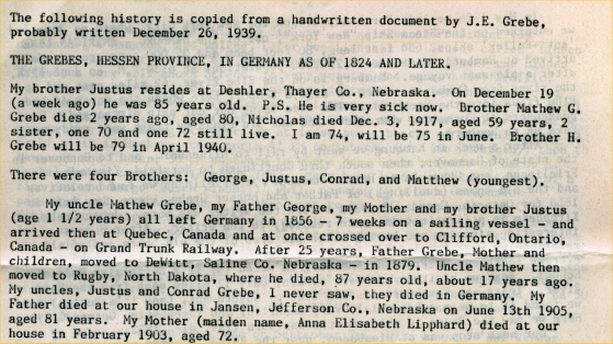 In Hope Church Cemetery, Jefferson County, Nebraska is ""George Grebe - April 14, 1824 -Jun 13, 1905, and "Frau von George Grebe - Anna Elisabeth Grebe - Jul 16, 1830 - Feb 21, 1903."
