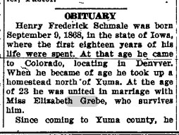 In 1900 Henry Schmale Sep 1868 Iowa has been married 8 years to Elizabeth July 1867 in Canada, parents in Germany. They have Annie, Mar 1892, Maggie Aug 1893, Althea July 1898, and Ella Apr 1900, all in Colorado