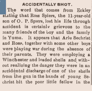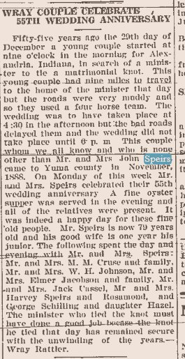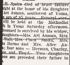 November 1905 "John Speirs and brother-in-law, Mr. Parker, of Robb, are Yuma visitors today."