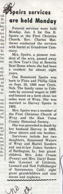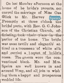 May 1899 "Miss Sarah Speirs and brother Harvey visited with the Misses Minnie and Rola Cunningham of Wray last week."