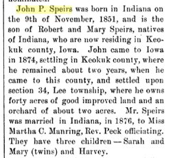 In 1880 Adair County, Iowa, John P. Speirs is farming, 28, with martha 27, Mary and Sarah both 3, and Harvey ten months old.