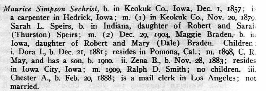 (Sarah SPEIRS Sechrist 1858-1938 is buried in Inglewood, California # 41010827.)