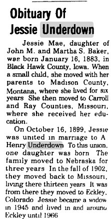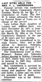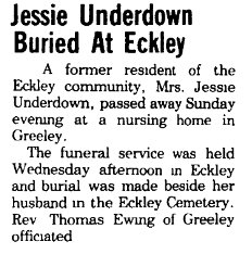 August 22, 1957 "Mrs. Joe Underdown of Denver passed away at her home August 13 from a heart attack. Mrs. Underdown lived near Eckley many years. Glenn Pittman and Jessie Underdown went to Denver Saturday to attend the funeral.”