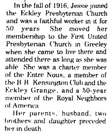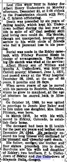 August 22, 1957 "Mrs. Joe Underdown of Denver passed away at her home August 13 from a heart attack. Mrs. Underdown lived near Eckley many years. Gean Pittman and Jessie Undedown went to Denver Saturday to attend the funeral."