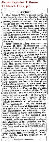 One family researcher wrote: Julia Ann Jemima Avery; born May 26, 1867 in covered wagon in Illinois. Dropped her name and took her mother's name of Marion Avery. Married Eugene Dale Gibbs, Sr. Marion Avery at birth was named Julia Ann Jemima Avery, but so disliked the name she adopted her mother's name of 'Marion'. In later life she used the name Julia Marion, but was known most of her life by the nickname "Mamie." She married Ralph Hayward Willis September 13, 1906 at Mason City, Iowa, with her children, nine year old Ruth, and six year old Dale present. He was born November 11, 1875 in La Crosse, Wisconsin and was a freight brakeman on the Chicago Great Western Railway. They resided in Mahnomen and Hawley, Minn., also Bloomington, Nebraska. Later they went farming near Haigler, Nebraska, and in 1911 he filed on a homestead six miles north of Wray, Colorado. Rented the homestead and eventually sold it. Moved to Silver City, New Mexico and operated a Confectionary store, later moved the business to Deming, New Mexico. After WW I returned to Colorado, living in Brush, and later on a farm 20 miles from Delta owned by the daughter. She disposed of it and the family moved to Delta, Colorado, and later to Brighton, Colorado where they were divorced in 1925. No children of this marriage. Court granted permission to drop the name of Willis and resume the name of Gibbs. She moved to Los Angeles, California with her daughter in October 1925- |