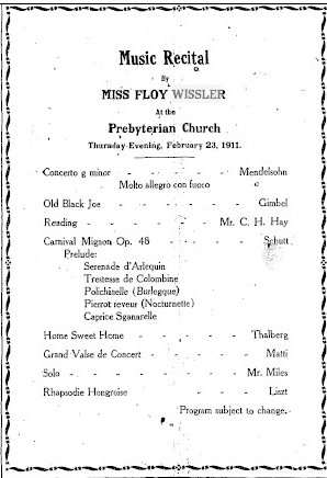February 1911 "Miss Floy Wissler, who is to take charge of Mrs. D. C. Funk's music pupils,