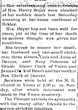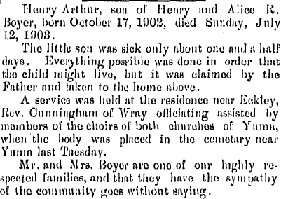 In the Yuma Cemetery Henry Arthur Boyer 1903 and Alice R. Boyer 1903, are with "inf son of Henry 1903" and a "Henry Boyer 1946"