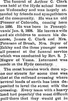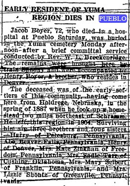 1900 Wray "Martin Deyo of Yuma and Henry Boyer of Eckley were business visitors to our town Saturday. Mr. Boyer bought a buggy of Counter's lumber yard while here. He is the new owner of the Mumford place."