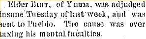 The 1887 Baptist Home Mission Monthly reported that J.D. Burr had been assigned to Yuma, Colo and vicinity. In 1892 a J.D. Burr received fewer than 6,000 votes for Congress on the Prohibition ticket. Maybe he's the one who was pastor at Union Iowa in 1878, and Afton and Creston Iowa in 1878..., and mentioned in Pella 1892 - 1894