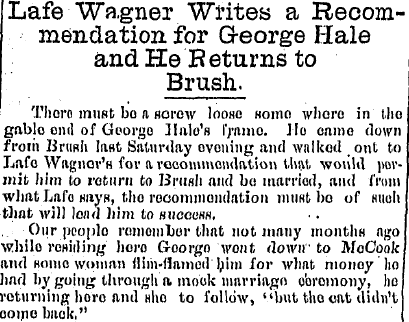 September 1907 "George Hale of Brush was down Saturday for a visit."