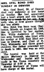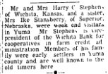December 25, 1948 Mr. and Mrs. M. L. Stephens of 2960 Muscupiabe drive, telephone 5-9338, are serving turkey dinner today to a large group of relatives. The party numbers Mr. Stephens' mother, Mrs. Leona Stephens, of Azusa; his brother-in-law and niece, Ivan Hart and daughter, Carol, of Sierra Madre; Mrs. Stephens' mother, Mrs. Lena Bulkeley, of Anaheim; Mrs. Stephens' niece, Diane Polltsch, of Pomona; Mr. and Mrs. T. J. Bradley (Bonnie Stephens) and twin sons, Tommy and Jonnie, Long Beach; Mr. and Mrs. Karl McGowen (Delores Stephens) and children, Stephen and Kathryn, Victorville; Mr. and Mrs. William Blatnick (Darlyne Stephens) and son, Terry. April 1947 "Mr. and Mrs. Karl McGowen welcomed a daughter at St. Bernardine's hospital Tuesday morning, April 22, at 5:45. She weighed five pounds, three, ounces, and has been named Kathryn Jean. Her mother is the former Dolores Stephens and the maternal grandparents are Mr. and Mrs. M. L. Stephens of 2960 Muscupiabe drive. The paternal grandparents are Mr. and Mrs. Walter McGowen of Rialto. Kathryn Jean has two great-grandmothers, Mrs. S. H. Bulkeley of Anaheim and Mrs. Preston Stephens of Azusa. She also has a brother, Stephen Lee, four years old." |