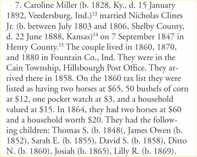 In 1870 Fountain County Indiana, Nicholas and Caroline Clines have Thomas S. 21, James O. 17, Sarah E. 15, David S. 12, Ditte N. 10, Mary C. 7, Josiah 5, Lilly R. six months, and Lydia Miller 78.