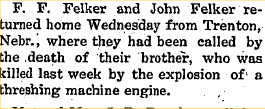 1914 Mr. and Mrs. C.E. Felker and Mrs. L.E. Felker of Trenton were visiting with John and Fred Felker southeast of town.
